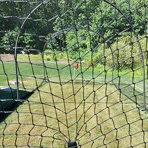 I teach hitting in my backyard and have used two of these (placed end-to-end). The size of the netting allows me to use the Jugs Small Balls as well as the Jugs Small Ball Pitching Machine.The nets have been up for about 2 years now and are holding up well. I do take them down if I am expecting a lot of wind – although there have been a few times that I was unable to take them down in a few storms and they still held up.The cage is easy to put up, especially with the help of another person. It’s not to terribly difficult to put up by yourself though.